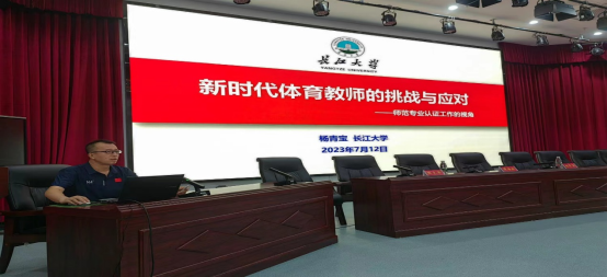 2023年7月12日,球王会体育平台网页体育教育系主任杨青宝副教授应荆州区教育科学研究院的邀请,参加荆州区2023年暑期中小学体育与健康教师专业能力提升培训。在荆州市实验小学(荆北校区)大礼堂,杨老师为荆州区体育教师开展了题为《新时代体育教师的挑战与应对》的专题讲座。讲座由荆州区教科院体育教研员梅江老师主持。