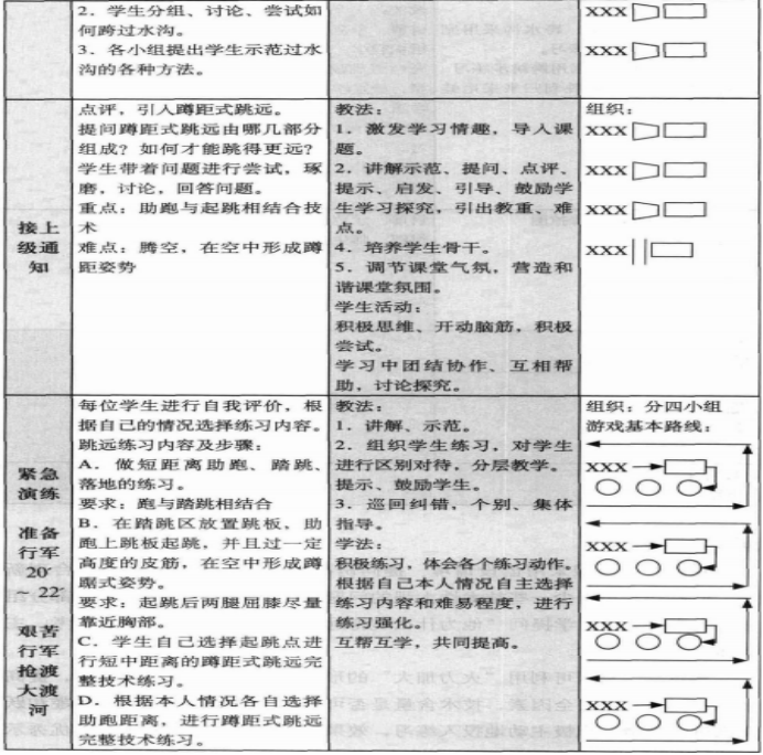 本教案体现了新课程改革的理念,采用了“自主、参与、合作、探究”的教学方法和新颖的情境式教学,充分地发挥了教师主导和学生主体性,运用游戏等教学方式,较好地激发了学生参与运动体验的乐趣,教师根据教学内容和学生的实际,通过设置相关的故事情节、场地器材和情感氛围提高学生体育学习的情趣,从而发展学生基本活动能力,发展学生体育兴趣。情境教学模式通过理解、尊重、参与的作用能够有效提高学生的学习兴趣。其特点是通过情境设计使学生产生优势兴奋中心,获取最佳的注意力。情境教学用潜意识调节意识,用情感和审美调节意识。体育情境教学模式能够有效提高学生的学习兴趣和参与度,可以使学生在不知不觉中得到发展,情操得以陶冶。在本教案中,全面体现了学生的五大学习领域目标,学生的主体性和教师的主导性得以体现。但是,教学设计过于求全求大,目标不明确,在本教案的教学过程中,欠缺一些专业知识技能的传授,运动过程和强度的标准把握不清,课程内容安排得太多太杂,不能很好地保证学生充分的专业运动练习。